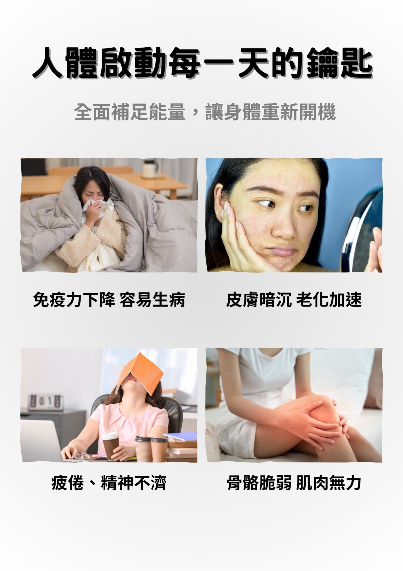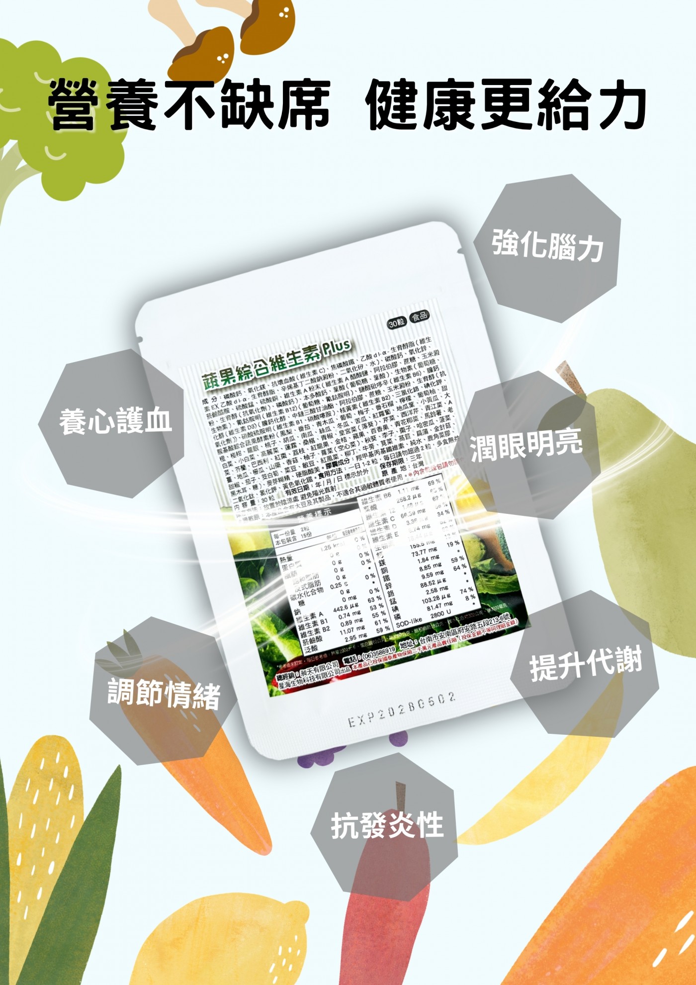 針對忙碌生活、外食族、蔬果攝取不均衡的人設計,結合多重維生素、礦物質、蔬果精華與益生菌配方,作為日常營養補充與健康維持的全方位支持。