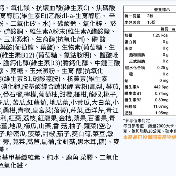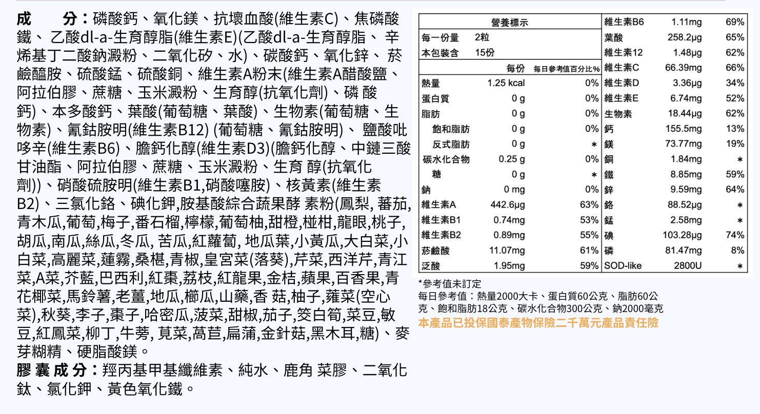 - 12 種維生素+9 種礦物質:補充日常營養來源,支持全方位健康狀態。