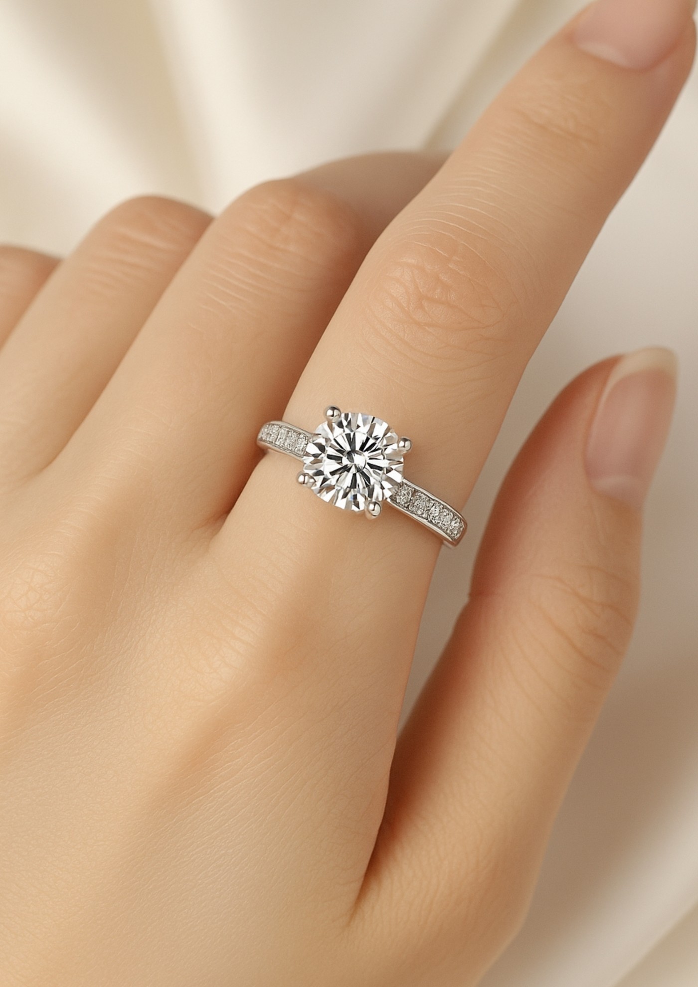 戒圈採優雅分岔線條設計,兩側細鑽延伸如星光大道,將視線自然引向中央主鑽,在細膩與璀璨間取得完美平衡,