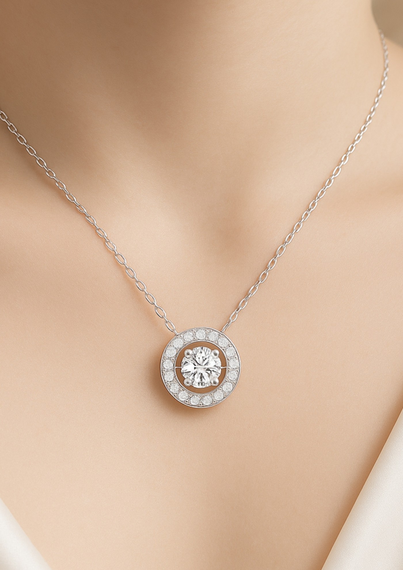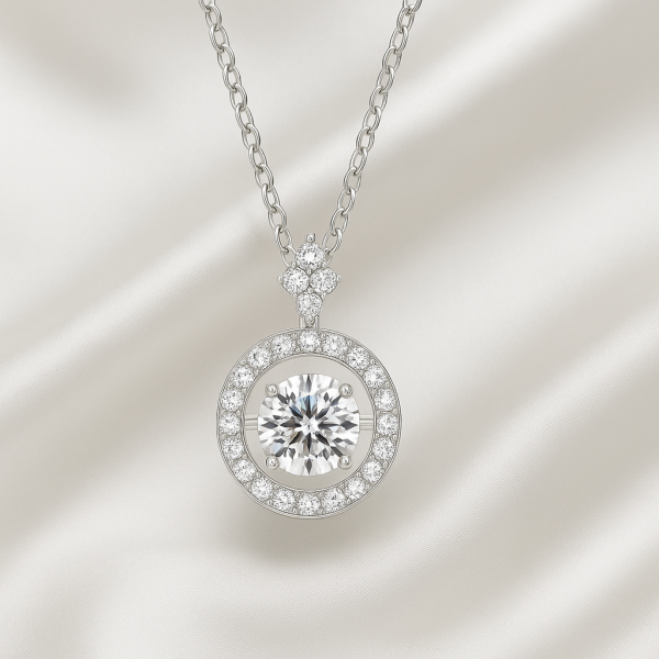 「觸動」以圓形光暈作為設計語言,中央莫桑主鑽凝聚耀眼焦點,外圈細膩排鑽層層包裹,如心跳擴散的漣漪,將那份悸動化為永恆光芒佩戴於胸前。