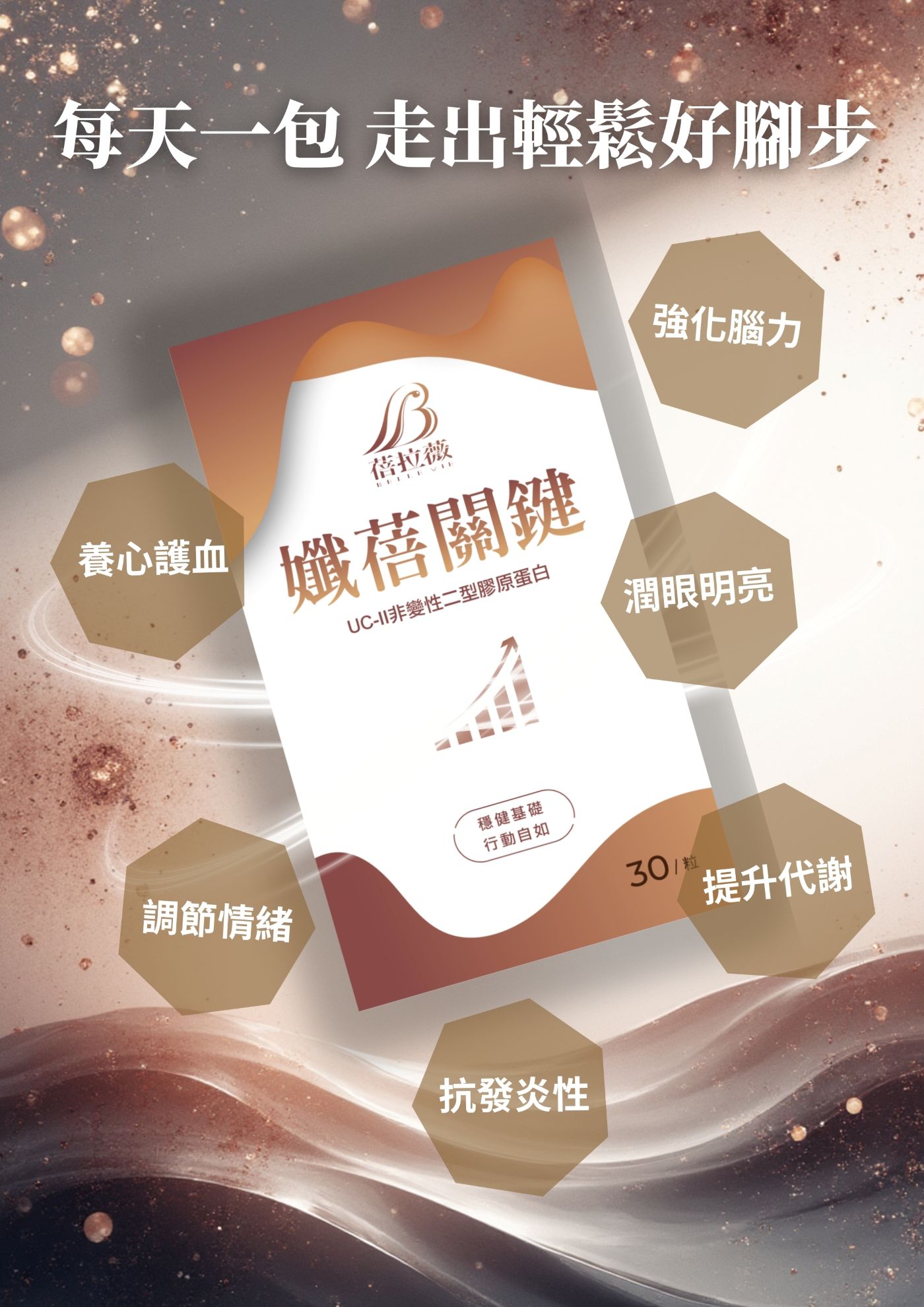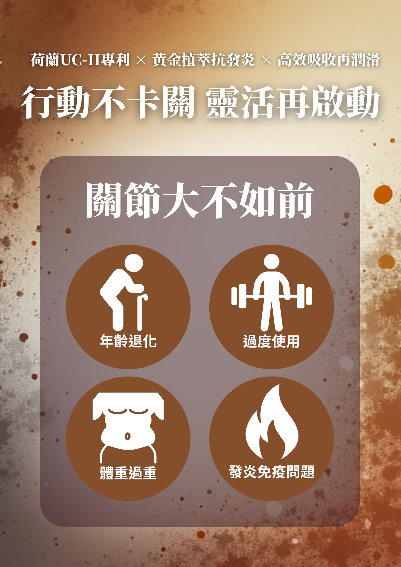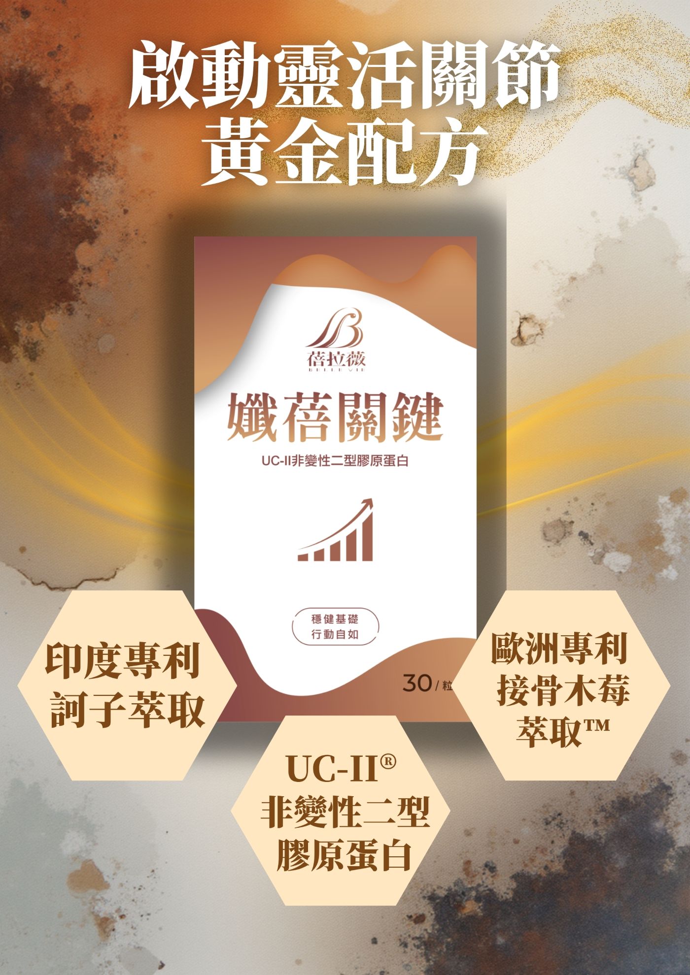 適合重視關節活動度、日常行動舒適感與靈活狀態的人, 結合多國專利營養成分,作為日常保養支持, 陪伴你穩定每一步,走得更輕鬆、更安心。