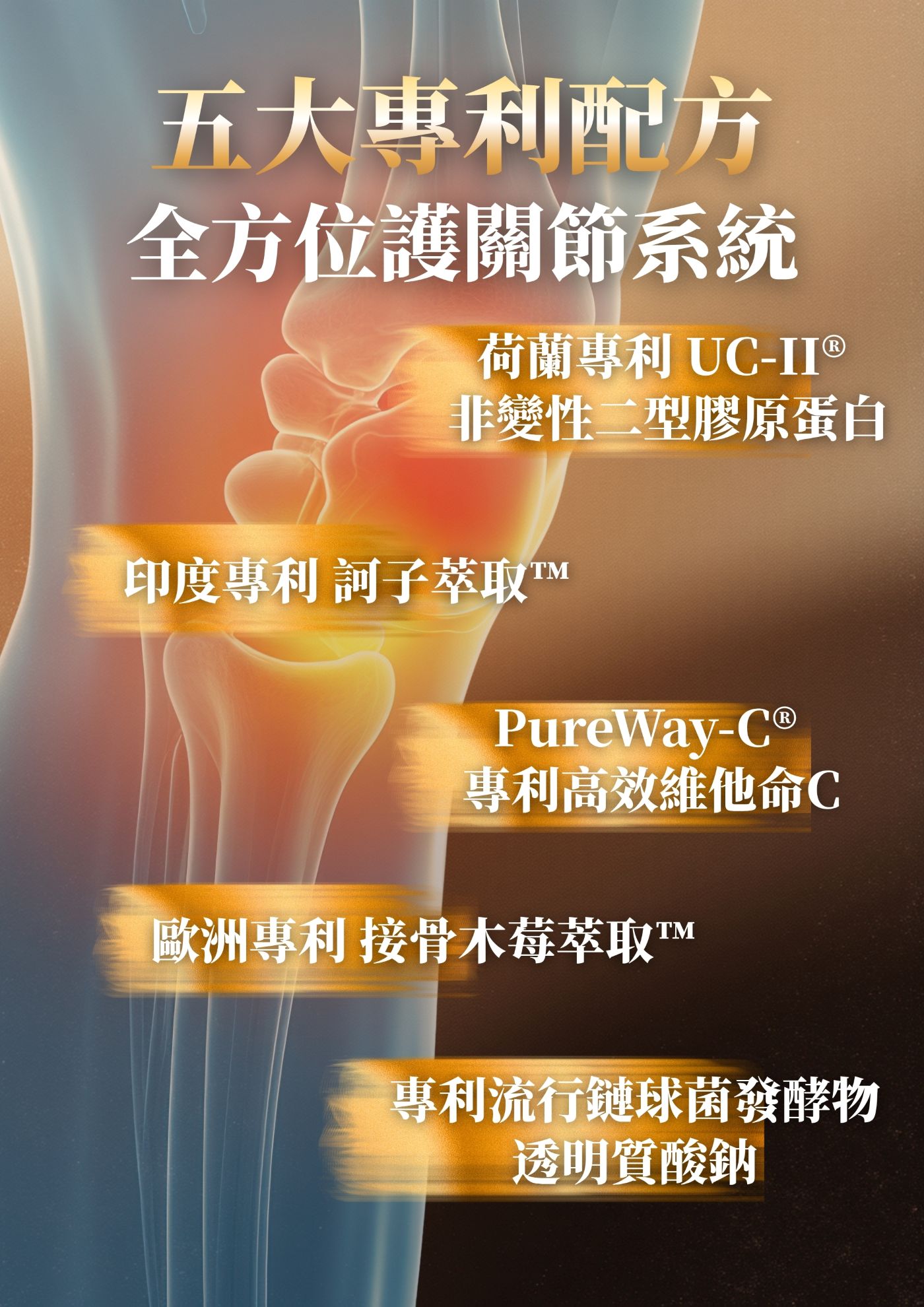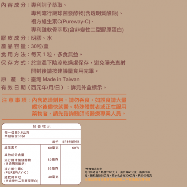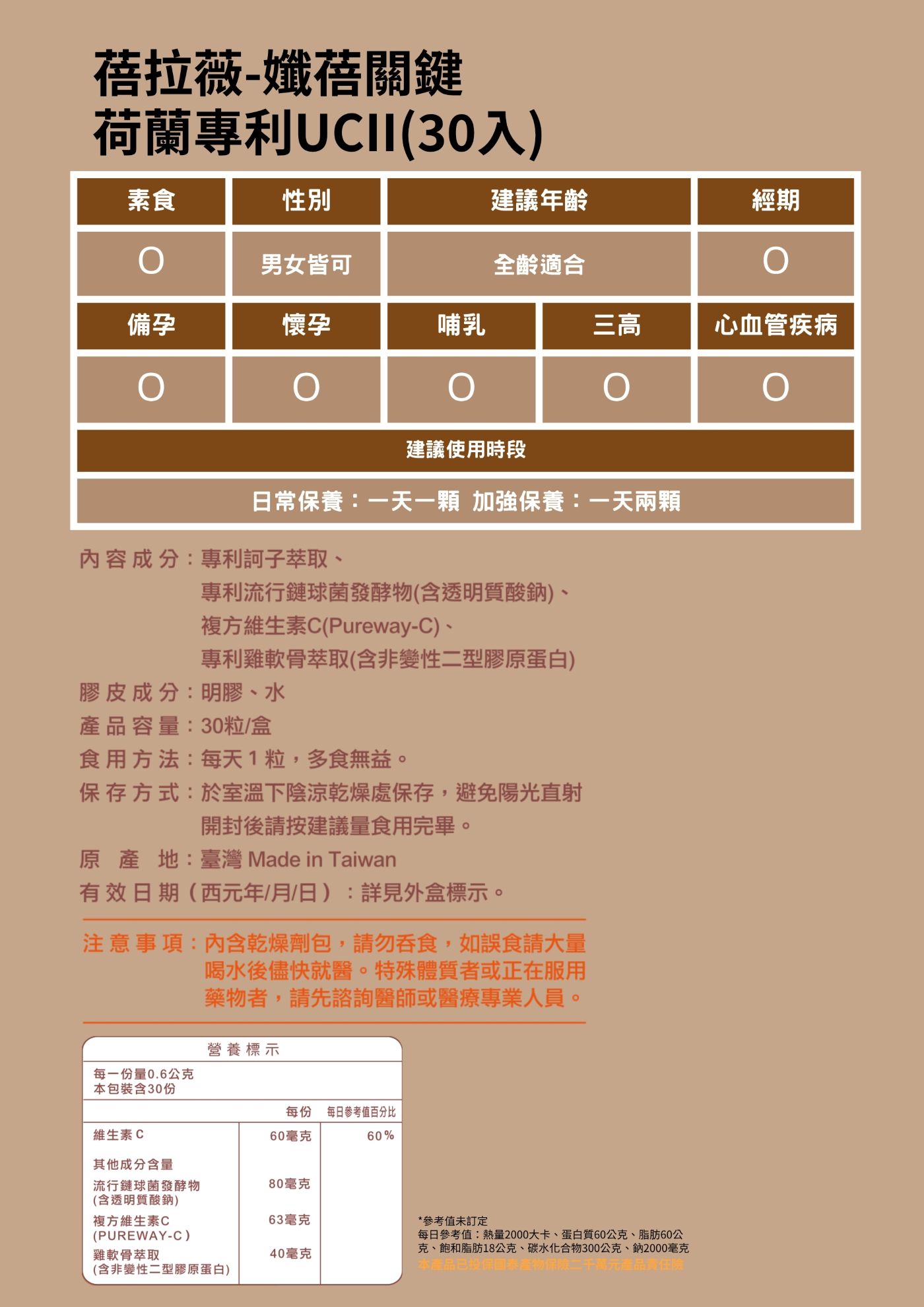 - 荷蘭專利 UC-II 非變性二型膠原蛋白: 雞胸軟骨萃取來源,每日 40 mg 原廠授權建議攝取量, 是國際間廣受關注的關節保養成分之一。