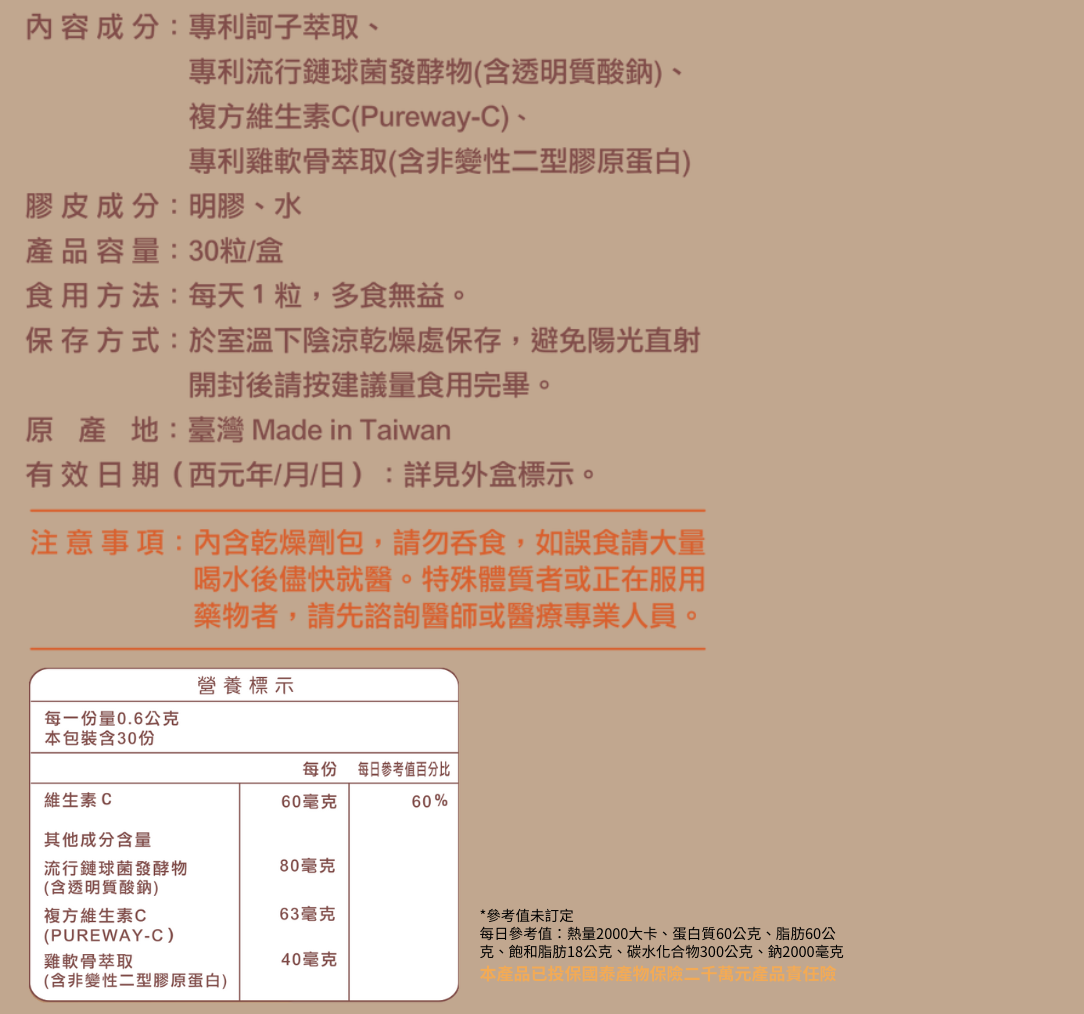 - Pureway-C 複方維生素 C: 天然柑橘來源維生素 C,支持膠原蛋白應用與營養吸收運用。