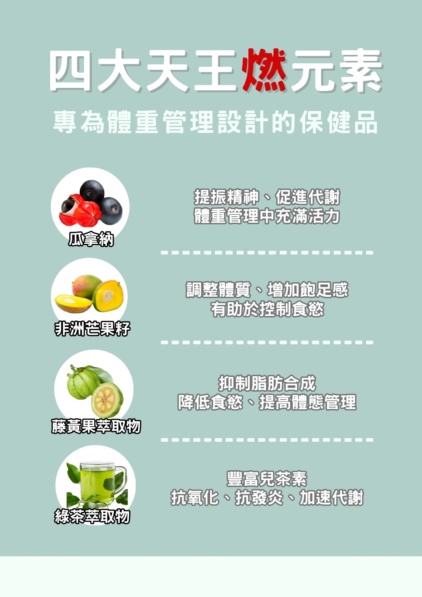 專為關注體態管理與代謝調整的人設計,結合綠茶萃取、藤黃果萃取、非洲芒果籽萃取及瓜拿納萃取等成分,提供日常代謝支持與能量補給,幫助維持更好的體態管理狀態。