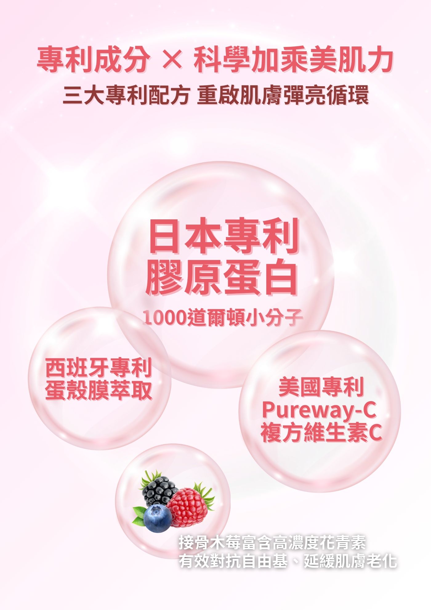含多種型態膠原蛋白、彈性蛋白與玻尿酸來源,作為支持肌膚柔嫩、Q彈保養的理想配方。