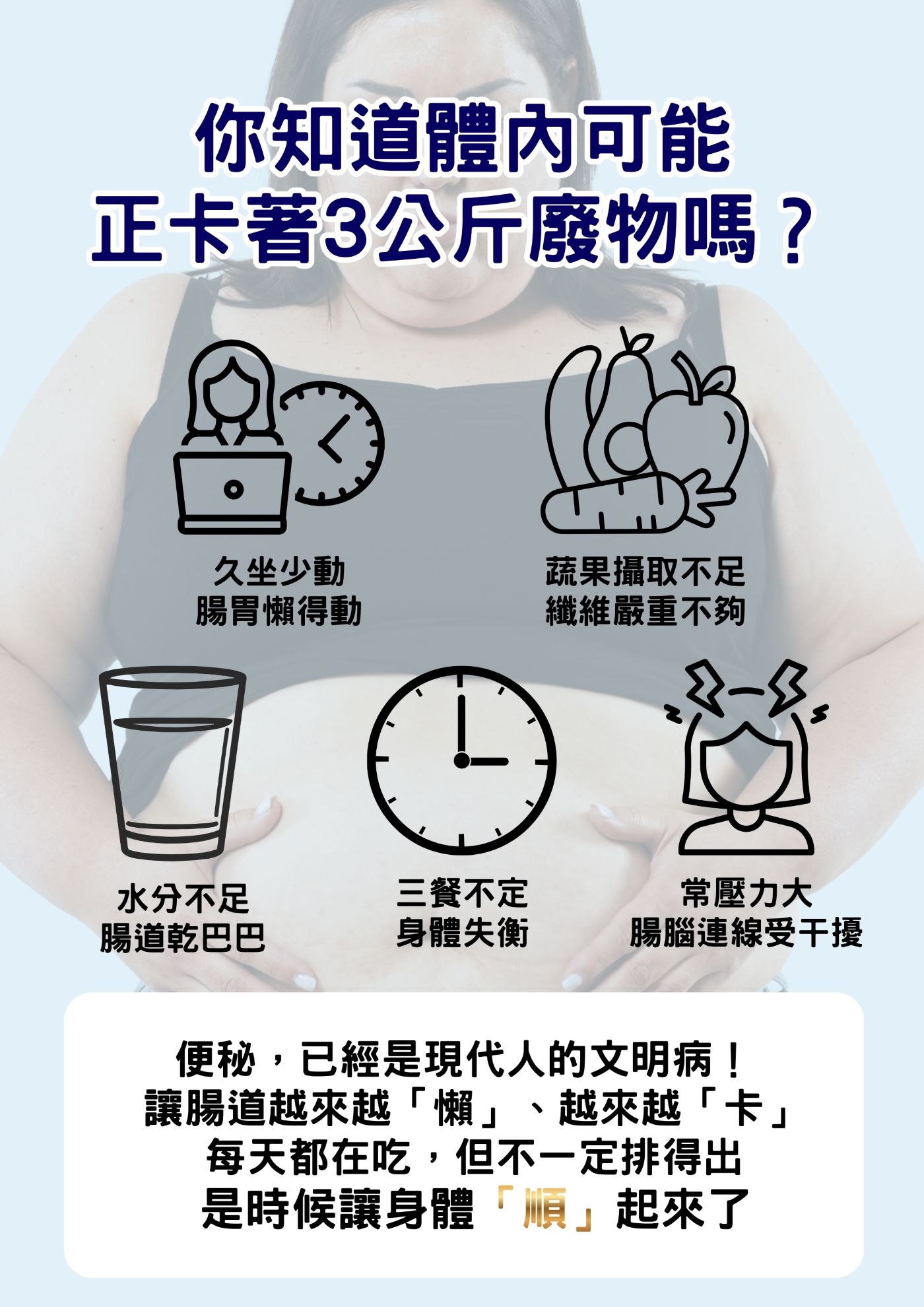 適合外食族、蔬果攝取不足、久坐久站、生活忙碌、飲食不規律的人,作為日常保養與腸道狀態維持的補充支持,幫助養成更好的排便與生活習慣。