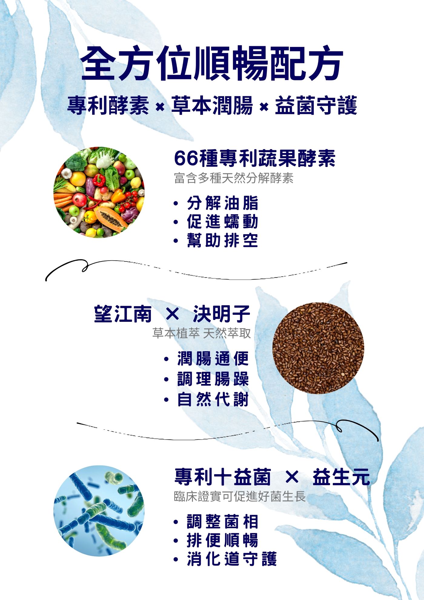 - 多重蔬果酵素(專利 66 種蔬果酵素):日常飲食支持來源,適合外食族與蔬果攝取不足者補充。