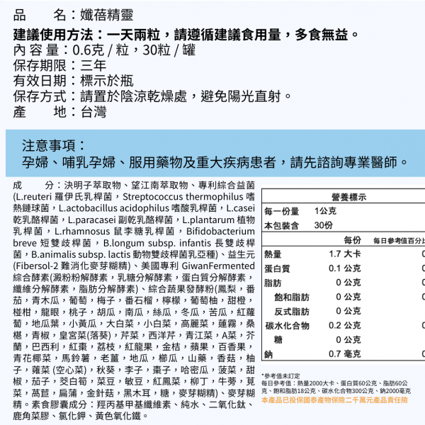 - 專利美國酵素複方:包含澱粉、脂肪、乳糖、蛋白質與纖維分解相關酵素,適合飲食量較高或喜歡美食的人搭配使用。