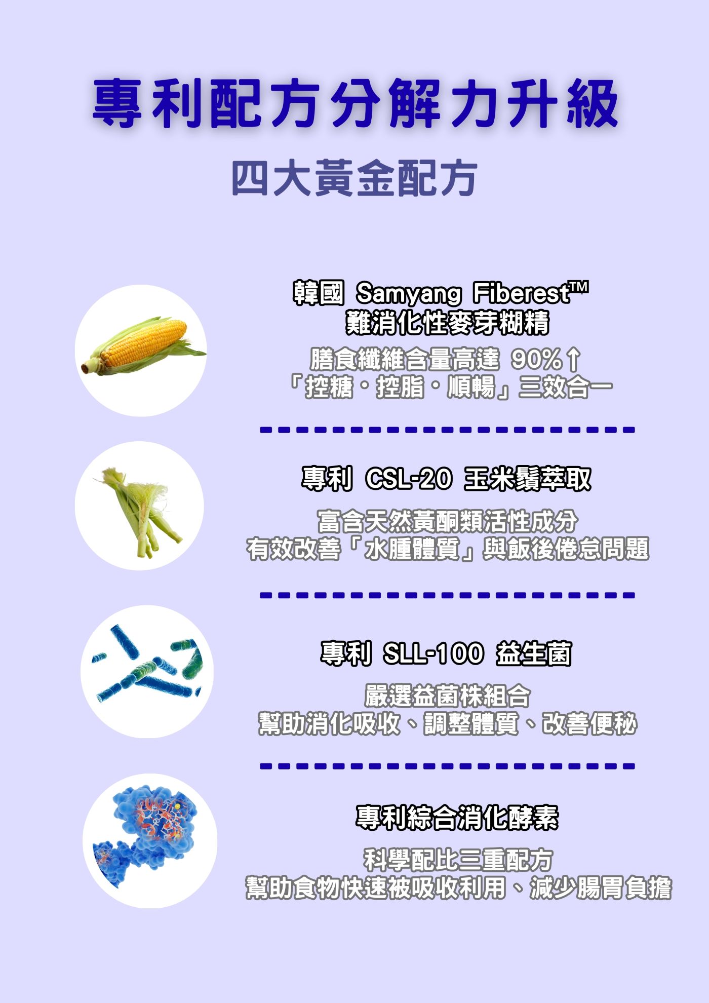 源於玉米,膳食纖維含量高達 90% 以上,補充日常所需水溶性膳食纖維,支持腸道蠕動與消化狀態,同時提升飽足感。