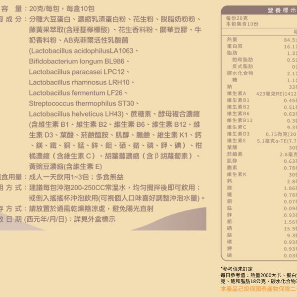 - AB 克菲爾活性乳酸菌,有助於調整體質與維持消化道機能