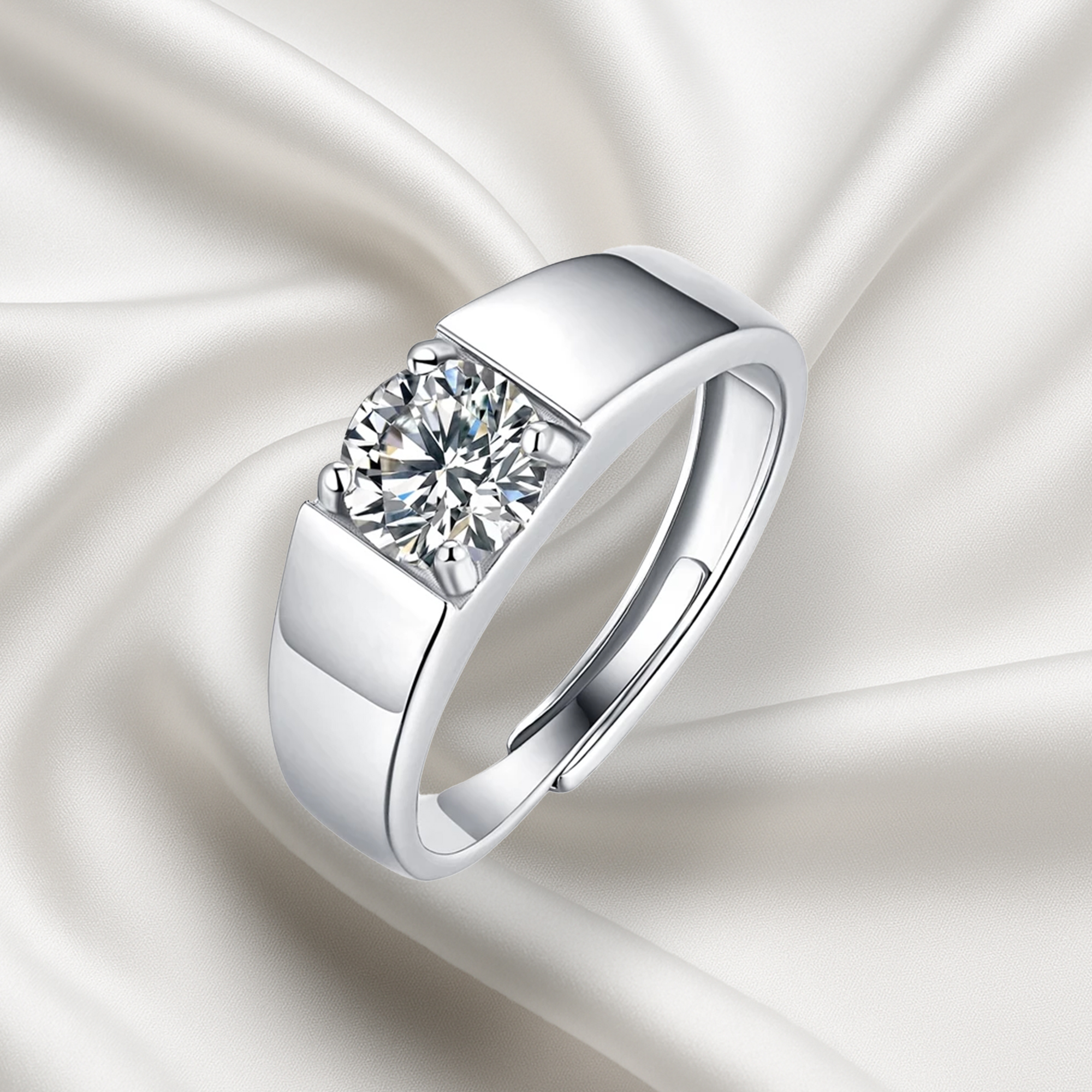 「風範」以俐落線條打造沉穩框架,結合厚實戒身與極簡設計,將男性魅力凝聚於中央那顆耀眼莫桑主鑽——低調,卻無可忽視。